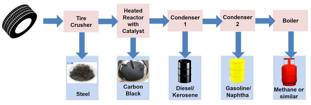 Currently, tires are deposited in landfill after use. Pyrolyst can be used to process for tire recycling. Due to the absence of oxygen in the process, carbon is output as carbon black rather than CO2. This makes Pyrolyst for Tires an environmentally friendly method to deal with the large amounts of tire waste created every year.