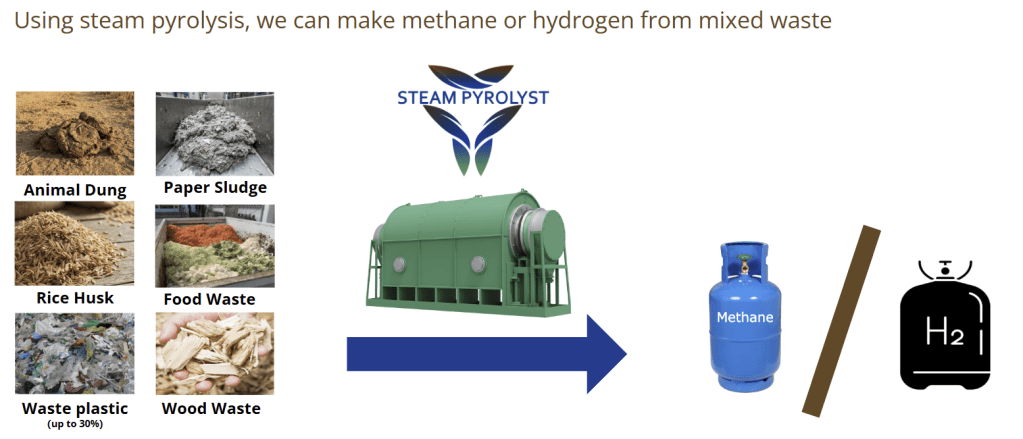 Steam Pyrolyst uses pyrolysis as pre-treatment at 200°C and then 600°C steam gasification to convert organic and plastic waste into green methane and charcoal. These products can then be converted into hydrogen.