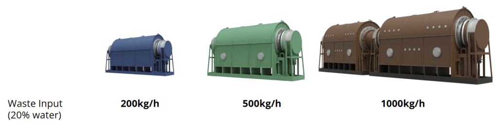 Fast Processing: Can convert waste to gas in about 20 minutes, compared to over ~30 days for classic wet fermentation. Different sizes are available as shown below.